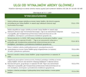 Przypominamy, że Osoby chcące skorzystać z nowych ulg od cen wynajmu Areny głównej zobowiązane są do wylegitymowania się dokumentem potwierdzającym prawo do ulgi. Oprócz tego, przy podpisywaniu umów będą Państwo proszeni o podpisanie oświadczenia dotyczącego spełniania warunków określonych w poszczególnych punktach w cenniku.